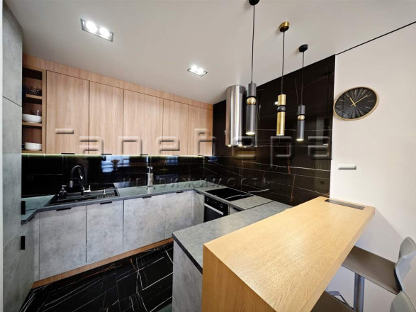 Чтобы создать атмосферу уюта и тепла, любимую кухню сделали очень функциональной и современной, фирмы Egger, здесь не только фасады из шпона, но и объемная барная стойка выполнена из дерева. Кухонный гарнитур оснащен всей встроенной техникой для удобства хозяйки.