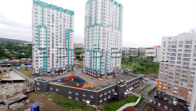 Окна с видом на сопку и флаг.