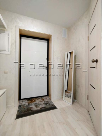Интерьер квартиры выполнен в спокойных светлых тонах: ламинат, обои, мебель, большое напольное зеркало, двери, кафель в санузле, натяжной потолок с точечными светильниками, небольшие детали декора. Все выглядит гармонично и создает атмосферу уюта.