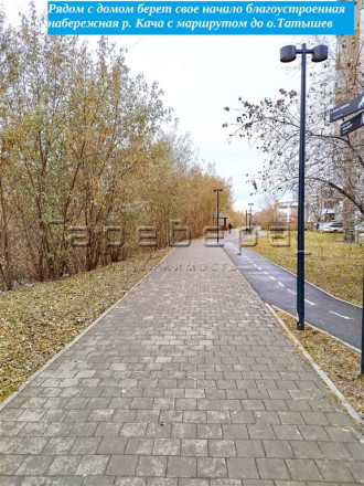 Придомовая территория: Двор дома закрыт, благоустроен, наполнен как детскими так и спортивными площадками. Парковочных мест во дворе для жителей дома предостаточно. Рядом с домом благоустроенная пешеходная и велосипедная набережная р. Кача им. Петра Пимашкова, проходящая через весь центр города Красноярска до Виноградовского моста через р. Енисей и острова Татышев.