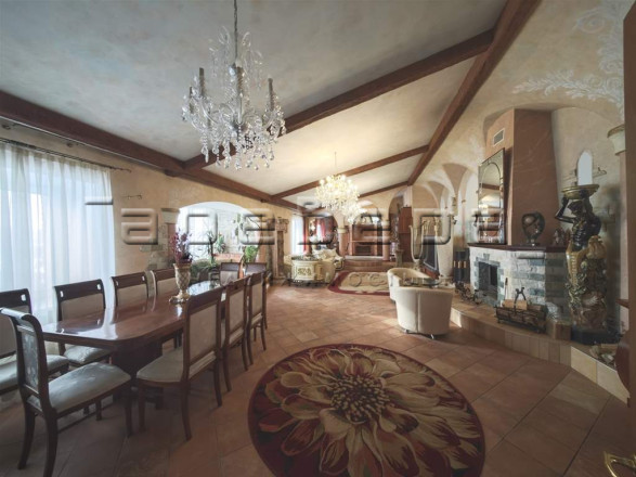Уникальная планировка и дизайн в просторной гостиной-кухне 90 кв.м. с 5-метровыми мансардными потолками. Дизайн интерьера сделан в замковом стиле с фресками ручной работы и мебелью из массива натурального дерева со встроенной техникой премиум-класса. Отдельная зона с грилем и мощной вытяжкой позволит вамлегко приготовить вкусные шашлыки.