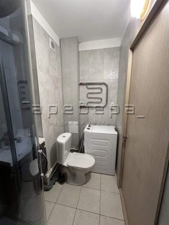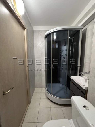Санузел: Современная отделка плиткой, установлена душевая кабина, тумба с раковиной.