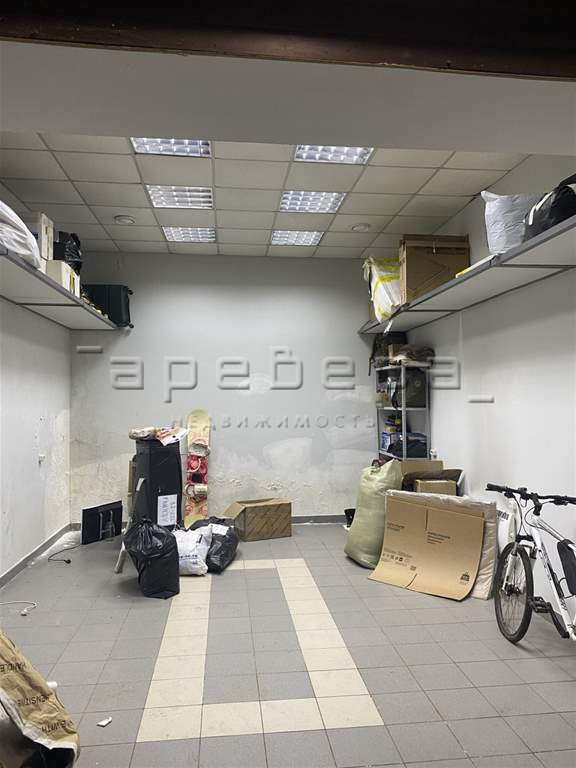 Площадь помещения 25 кв.м. Пол в кафеле, по бокам есть навесные полки. Потолки армстронг.
