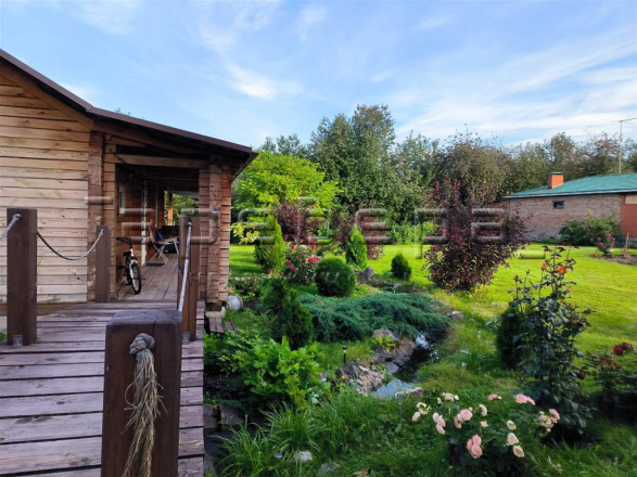 Ландшафтный дизайн участка. Ухоженный сад и небольшой огород (15,6 сот). Здесь растут деревья-хранители, журчат пруды с камнями с Байкала и Египта, цветут розы. За участком есть выход на небольшой лесной участок (3 сотки) и ручей.