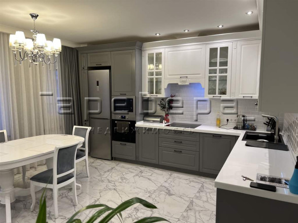 Кухня-столовая выполнена в современном стиле с высококачественной мебелью и техникой. Здесь есть все для удобного приготовления пищи: встроенная плита, духовка, холодильник и посудомоечная машина. Столешница из искусственного камня добавляет элегантности.